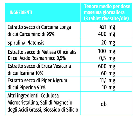 Ingredienti: Estratto secco di Eruca Vesicaria (Eruca vesicaria (L.) Cav., foglie) titolato al 10% in icariina, Estratto secco di curcuma (Curcuma longa L., Rizoma) titolato al 95% in curcuminoidi, agente di carica: cellulosa microcristallina, Estratto secco di Melissa (Melissa Officinalis L., foglie) titolato allo 0,5% in acido rosmarinico, Spirulina Platensis (Spirulina platensis Gomont Geitler) tallo polvere, agenti antiagglomeranti: sali di magnesio degli acid grassi, biossido di silicio; Estratto secco di Piper Nigrum (Piper nigrum L. frutto) titolato al 90% in piperina.